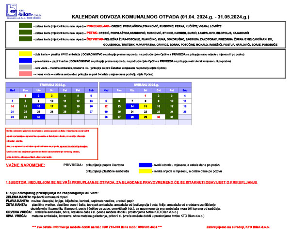 RASPORED ODVOZA MIJEŠANOG KOMUNALNOG OTPADA ZA TRAVANJ I SVIBANJ 2024. GODINE